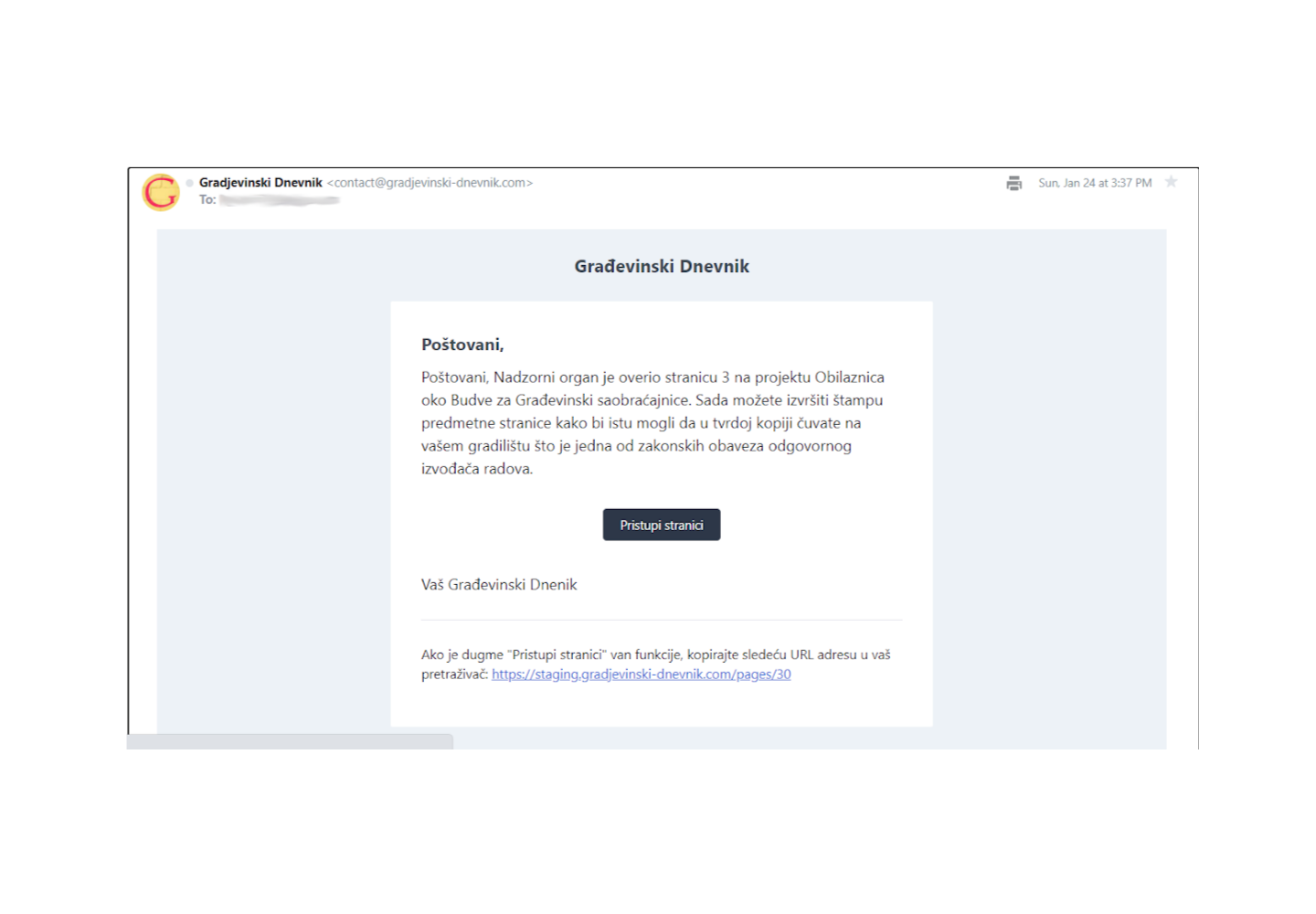 Email obaveštenja nadzornog organa o neažurnom vođenju građevinskog dnevnika.
