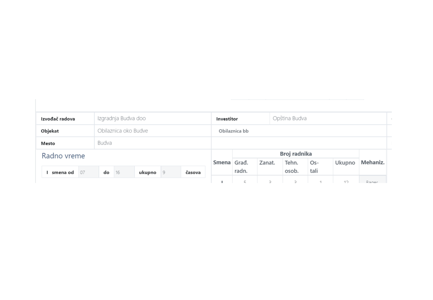 Automatsko popunjavanje osnovnih podataka o nazivu Izvođača, investitora, objektu i lokaciji svake stranice dnevnika.